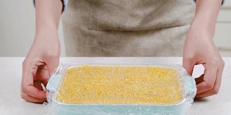 6.然後蓋上保鮮膜,放入冰箱冷藏一晚,再切塊食用(吃的時候可以配上糖桂花或蜂蜜哦)
