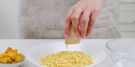 4.再來做黃米層:浸泡好的黃米洗凈,瀝幹水分,倒入深盤中。加入清水、米酒汁拌勻。放入南瓜塊,冷水上鍋,大火燒開後轉中火蒸1小時