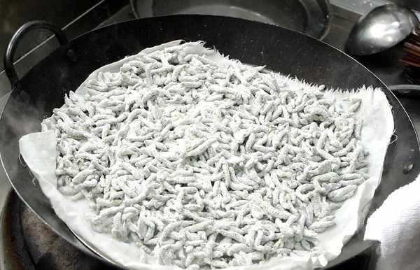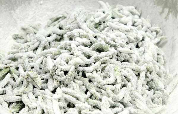 3.鍋內燒水,放上篦子,大火把水燒開,在篦子上鋪上白細佈,把裹好面粉的楮不揪均勻撒在篦子上,中火蒸8分鐘。