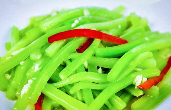 2.鍋內燒水,加入食鹽和植物油,水燒開以後把萵筍、紅椒絲倒入鍋中焯水20秒鐘,萵筍斷生後倒出來用清水沖洗幾下,控水備用,清水沖洗能使萵筍口感更脆。