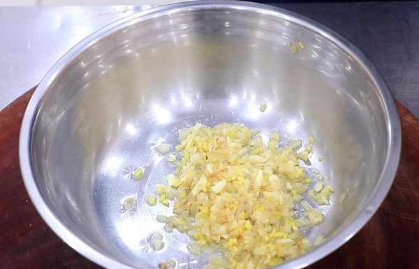 2.鍋內燒油,油燒熱以後放入洋蔥、薑蒜末,開小火煸炒一會兒,把裡面的水汽炒幹,蔥、薑炒香、炒成金黃色時起鍋倒入盆中。