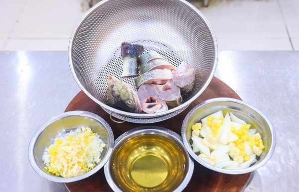 1.準備鱸魚一條,已經提前宰殺好瞭,清洗幹凈後切成均勻的小塊,放入清水中浸泡一會兒去除魚塊中的血水;切點洋蔥片、蒜粒、洋蔥粒放在一起,再切點薑末、蒜末;把浸泡好的魚塊清洗幹凈,瀝水備用。