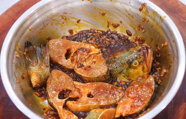 3.盆中加入蠔油5克增鮮,老抽5克調底色,生抽10克,食鹽2克,胡椒粉2克,黃豆醬5克,抓拌一下讓調料融合在一起,放入魚塊繼續抓拌,讓魚塊均勻裹滿醬料醃制10分鐘。