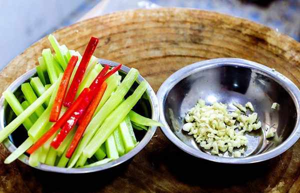 1.準備萵筍一根,削去外皮,先切成均勻厚片再改刀切成長條;切點蒜末、紅椒絲備用。