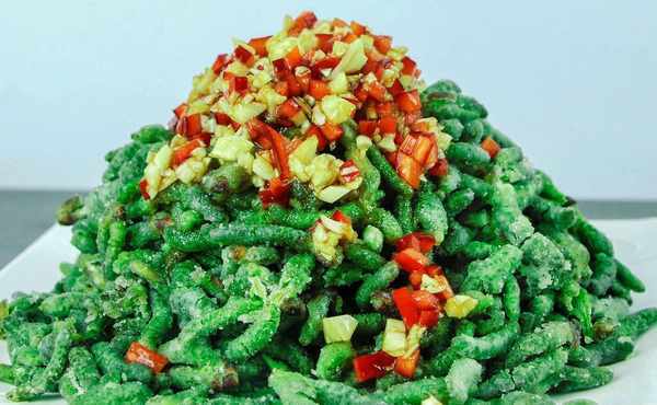 4.8分鐘以後楮不揪已經蒸熟,從鍋中取出倒入盆中,撒入食鹽1克,雞粉1克,快速顛盆抖散迅速降溫,防止坨塊粘連,拌勻以後即可裝盤,把調好的料汁澆在楮不揪上,美味即成。