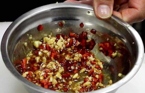 2.切點蒜末、紅椒粒放在一起,加入食鹽1克,香油5克,生抽5克,攪拌均勻。