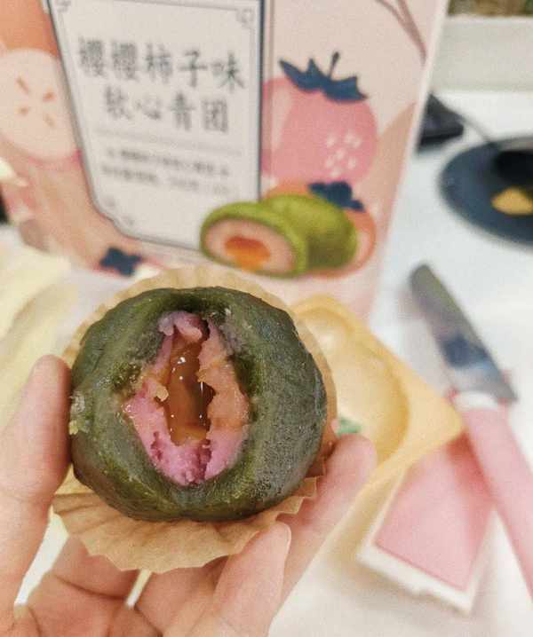 具有一百多年品牌歷史的中華老字號五芳齋同樣不遑多讓。它把春天的櫻花包進青團,取名「櫻櫻柿子」。櫻櫻柿子味道不膩,裡面的餡料不是很甜,但是非常之綿密,裡面的夾心是雙層,最裡面那層是柿子味的,外面的芯是豆沙,值得一嘗。另外還有一款「桃桃芝士山楂」,一切開,滿屋子都是它的香氣,喜歡酸甜口的朋友們可以盡情一試。