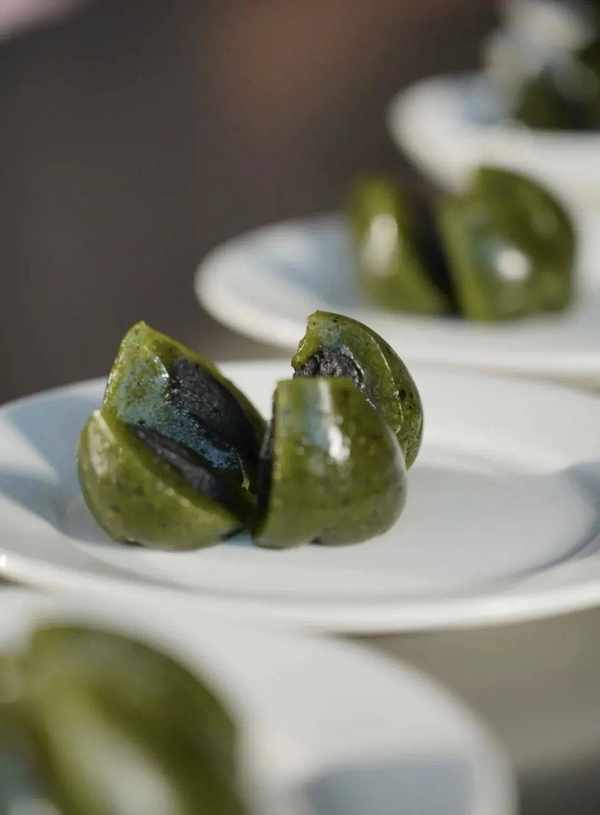 松露粒粒紅豆青團,選用東北紅豆,延用老北京糗豆40年煮沙工藝,不過特別將白砂糖替換為海藻糖,降低瞭熱量的同時,也將甜度控制在適口且不甜膩的程度。黑松露黑芝麻青團,一枚青團裡包裹著滿滿的黑芝麻餡,九蒸九曬芝麻傳統工藝,沒有油膩,隻有滿滿的香甜。在青團中加入黑松露這個西方三大珍饈之一,這是個奢侈而又大膽的嘗試;絲絲縷縷的黑松露香氣混入青團,艾草香、糯米香、松露香,層次豐富,很難不愛。