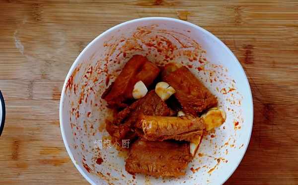 ③、經過上面2步清洗焯水的排骨已是非常幹凈瞭,裝碗裡加2勺料酒,1勺生抽、半勺蠔油,1勺甜辣醬,1勺蒜碎用手抓勻醃制30分鐘