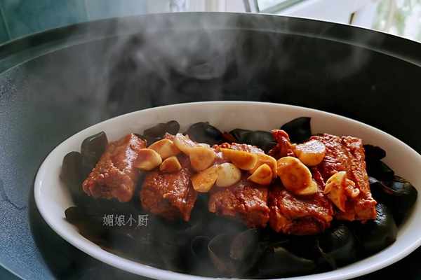 ⑤、蒸鍋加水燒開,放上蒸屜,再把裝好木耳排骨的蒸盤放入蒸屜裡,蓋鍋蓋,中火蒸40分鐘,排骨熟爛即可