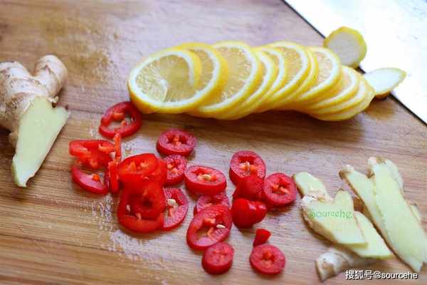 步驟1:備菜:生薑清洗幹凈切片、紅辣椒清洗幹凈,切好,檸檬外皮用鹽搓一搓,再用清水清洗幹凈,切片。把檸檬籽用牙簽剔出來。
