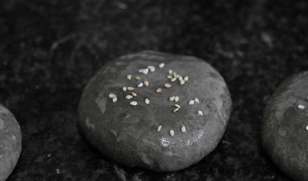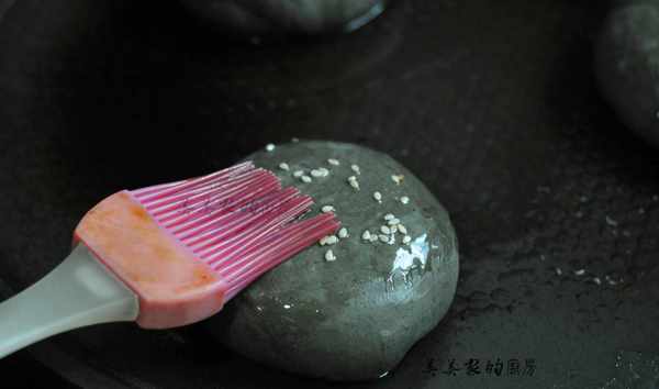 ?揉好的小劑子團成圓球狀,稍微按扁後,?在?表面刷上水,撒上芝麻裝飾。
