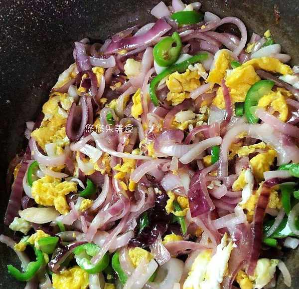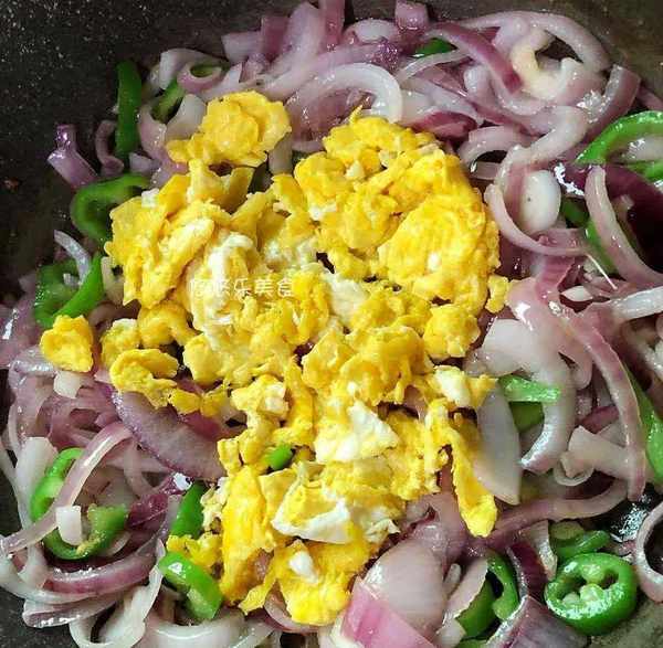 2.雞蛋下鍋炒的時候,不要一下子炒太熟,7分熟後撈出放盆中。等鍋中的洋蔥快熟後再倒入;