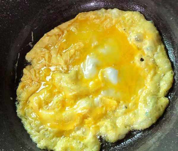 5.鍋中燒油,熱油後將準備好的雞蛋液倒入鍋中,鏟子輕輕地翻動,將鍋中的雞蛋炒至凝結成塊;