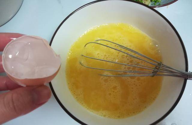2.六個母雞蛋打入碗中,裡面加入少許的精鹽白醋調味。用筷子順時針攪拌均勻就可以啦。把準備好的菠菜放進來。用筷子攪勻。