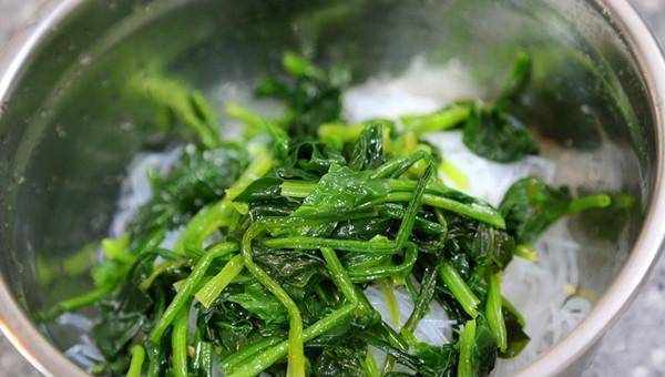 3.炒鍋內加入適量的清水大火燒開,水燒開後把準備好的粉絲放進去,汆燙20秒,然後立即撈出。再放入準備好的菠菜,大火汆燙立即撈出。