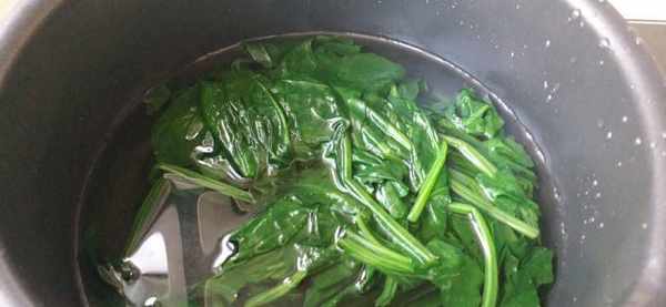 1.新鮮的菠菜,我們放在清水中給它沖洗幹凈。然後切成三厘米左右的小段。炒鍋內加入適量的清水大火燒開,燒開後加入半勺食用油。把準備好的菠菜放進去汆燙30秒立即撈出控水。