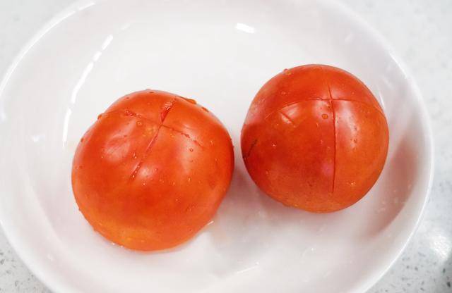 2、番茄洗凈後用小刀在番茄底部劃十字
