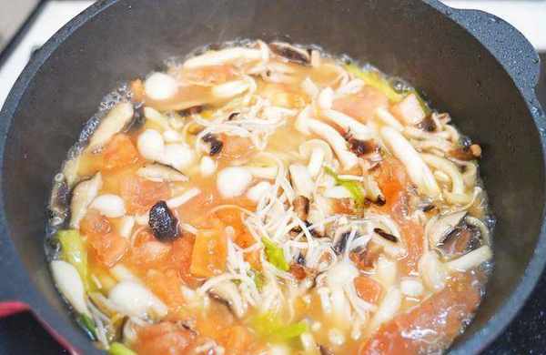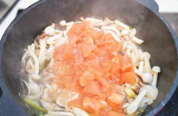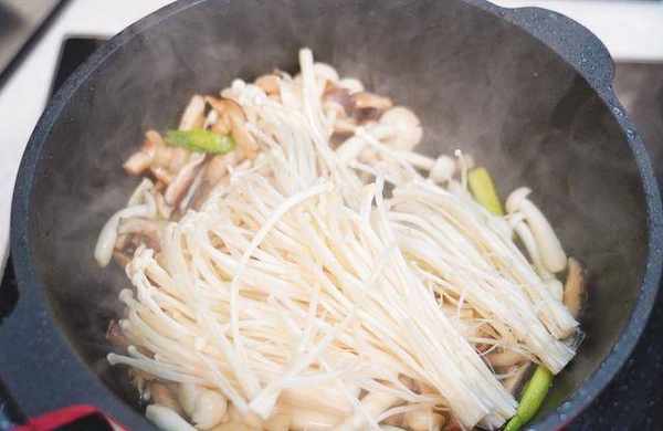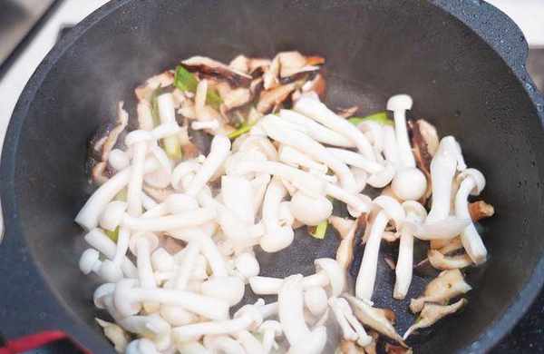 7、放入洗凈去蒂的白玉菇翻炒出香味