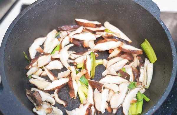 6、放入洗凈切成薄片的香菇翻炒出香味