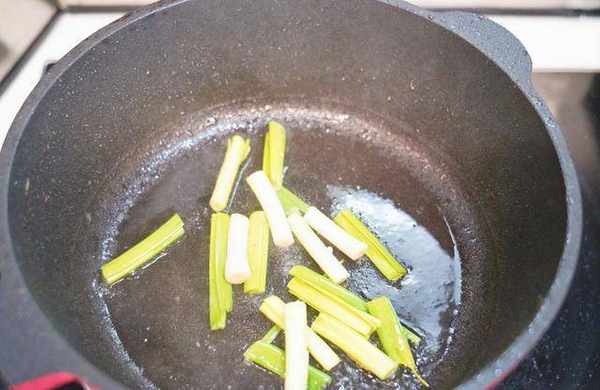5、蒜苗洗凈切段後放入熱好的油鍋裡煸炒出香味