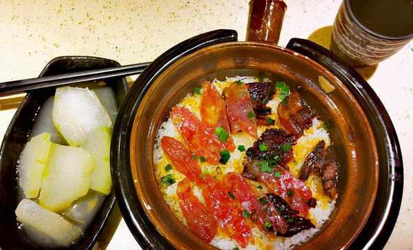原料:大米、糯米、臘腸、雞蛋、小油菜、生抽、蠔油、涼開水、食用油、砂鍋