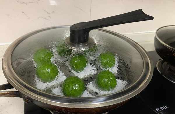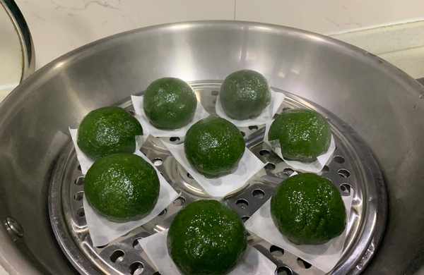 水開後放入鍋中蒸6~10分鐘。時間的長久看鍋的大小青團的多少。時間太長的顏色容易變暗並且塌陷,我這個蒸瞭8分鐘,又燜瞭2分鐘,有點過瞭。