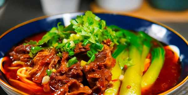 5、水燒開,面條下鍋,再次煮開後壓一遍冷水,徹底煮熟後撈起過涼水裝碗中,再燙一點青菜,倒入高湯,放一點蒜末,再舀一勺煮好的牛肉,澆上牛肉湯,最後撒上蔥花和香菜,一碗香噴噴的香辣牛肉面就做好瞭。
