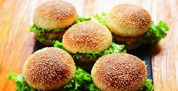 3、搓成長條。分成六個大小均勻的劑子。由外向內揉。整理成圓形。粘上一層清水。再沾上一層白芝麻。放進漢堡模具裡,密封發酵至兩倍大。