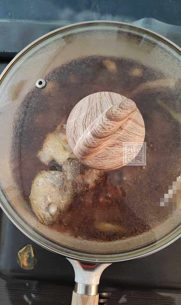 5、大火煮沸後蓋上鍋蓋,轉中小火燜煮15分鐘,燜煮至鍋中的湯汁隻剩下小半鍋的時候,就可以關火,這時黃魚並沒有燒好,關火後將平底鍋從灶臺上拿走,我們這時可以開始烹飪其他的菜肴,這樣做有2點好處: