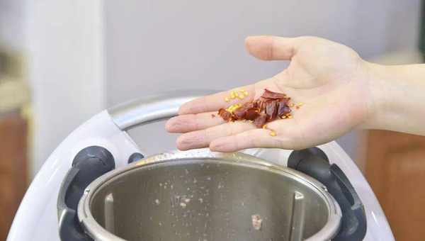 2.將蔥、薑片、蒜片、幹辣椒、食用油一起放入小美主鍋中,蓋上蓋子與量杯蓋,以3分鐘/120℃/反轉/速度1爆香;
