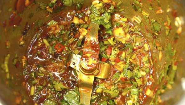 5.繼續加入切好的小米椒、蔥、香菜、生抽、郫縣豆瓣醬、老幹媽豆豉、花椒油、青檸汁,以10秒鐘/速度3混合均勻;
