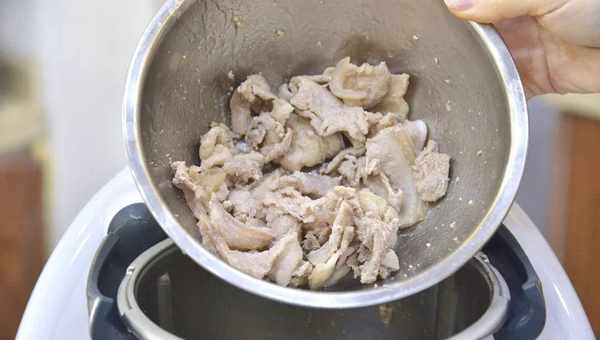 1.將五花肉片放入小美主鍋中,蓋上蓋子與量杯蓋,以8分鐘/V檔/反轉/速度小勺爆香,之後裝入碗中備用;