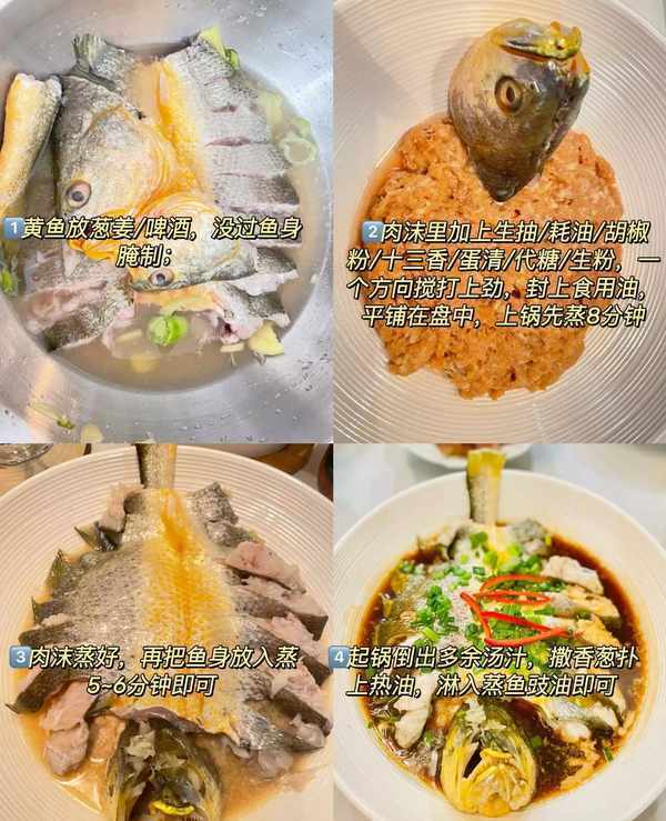 3魚先去頭,再把黃魚切成塊備用。水燒開後,先把魚頭放在肉沫上上鍋蒸8分鐘,取出後放上魚塊蒸5-6分鐘;
