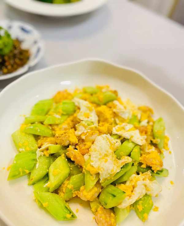 3再留少許底油,滑熟蝦仁,放入金銀蛋,加入少許鹽/代糖調味,起鍋前倒入黃瓜翻炒幾下淋入幾滴香醋出鍋。
