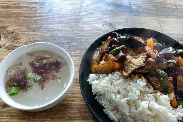 在漢中佛坪,吃一份10元錢的素菜蓋飯,老板也特意做瞭個清湯端過來。