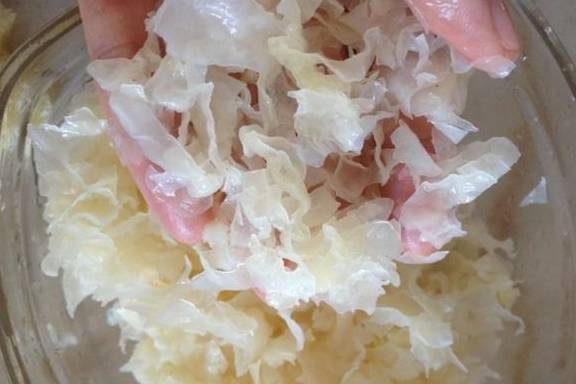 1,把銀耳放在清水中,清水要沒過銀耳,這樣才能完全浸泡銀耳,使得銀耳泡發得更好。如果時間不夠的,或者不想讓銀耳泡發太久,可以加入溫水浸泡。