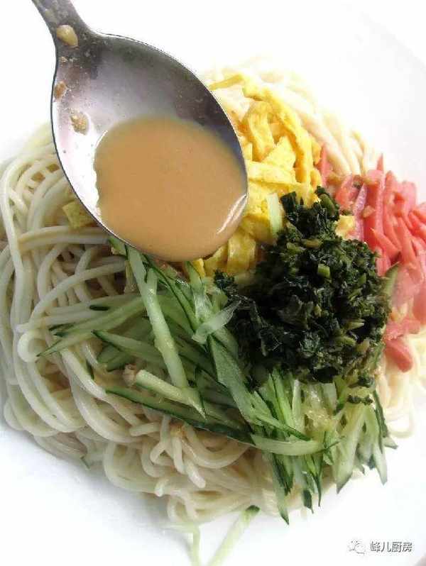 材料。面粉,雞蛋皮,火腿絲,黃瓜絲,大蒜,麻汁,生抽,醋,鹽,辣椒油。做法。