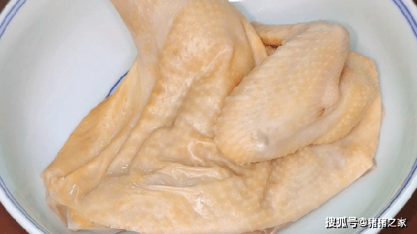 6.雞泡好後用漏勺撈出來,用筷子輕輕一擦就能擦動,而且沒有血水冒出來,就證明熟瞭。再放入的冰水中,這樣雞肉會快速的收縮,從而鎖住雞肉的水分,這就是雞肉鮮嫩的關鍵。