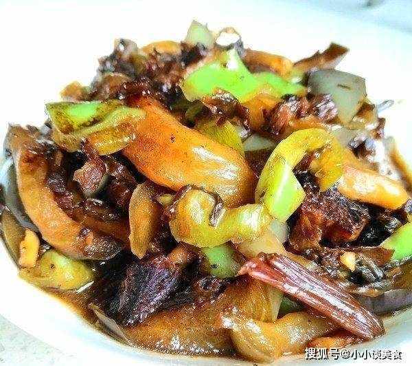 將炸好的茄子瀝幹水分,然後用剛炸過茄子的油加熱,加入西梅幹炒至酥脆,然後加入青紅椒炒香,然後加入茄子,2勺清淡醬油、1/2小勺糖和半杯水,不斷翻炒,直至汁液變稠