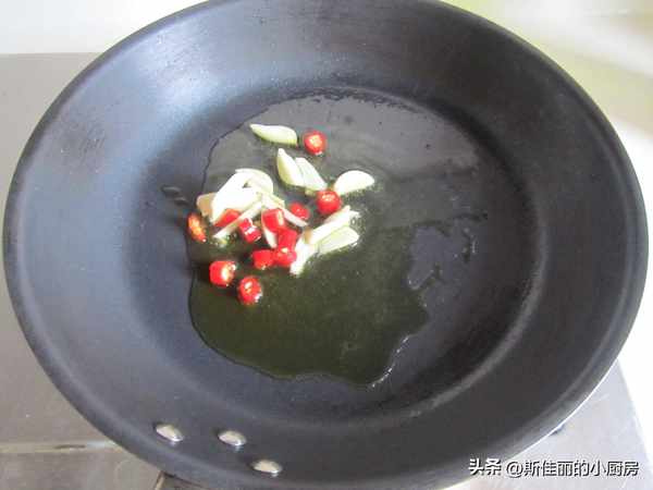 2. 燒熱鍋放入適量的油, 加入蒜末和紅椒圈進鍋煸炒出香味;