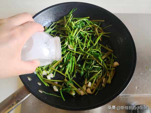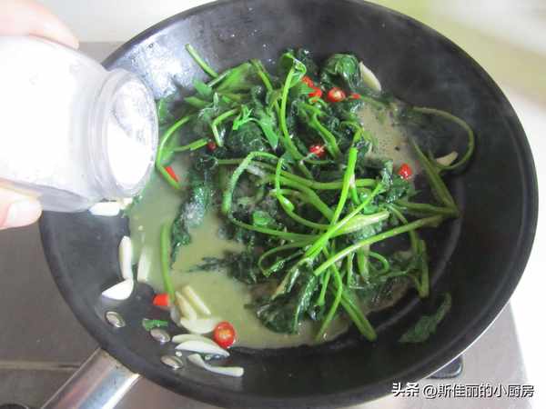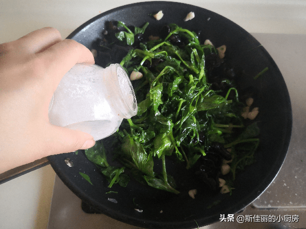 5. 豌豆苗微微變色後加入少許鹽調味, 翻炒均勻即可。