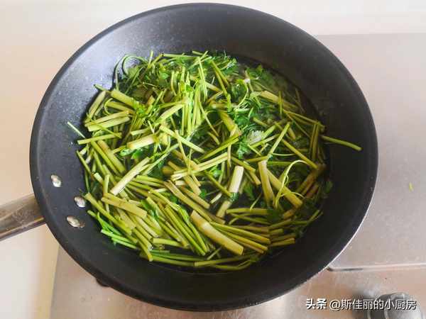 2. 將水芹菜梗放入鍋中焯燙變色後撈出備用; (焯蔬菜時加入少許鹽和油能保持蔬菜翠綠的色澤和爽脆的口感)