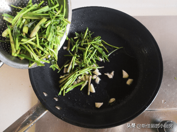 3. 加入洗凈的紅薯葉進鍋大火快炒,炒青菜時大火快炒能避免營養的流失;