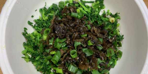 2、把過涼的面條菜撈出來擠幹它裡面的水分,把它放在案板上切成小碎段裝入小盆內,再準備適量的香蔥沖洗切碎,最後把浸泡好的黑木耳也剁碎都放入盆內即可。