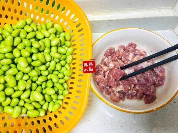 剝好的毛豆米沖洗幹凈,放到鍋裡焯一下水。瘦肉切成丁,加食用油淀粉抓均勻備用。
