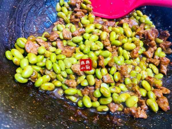 把焯過水的毛豆米倒進去,翻炒幾下,加入適量開水,不需要太多,孩子喜歡吃軟爛一些的毛豆米可以多加一些水多煮一會兒。
