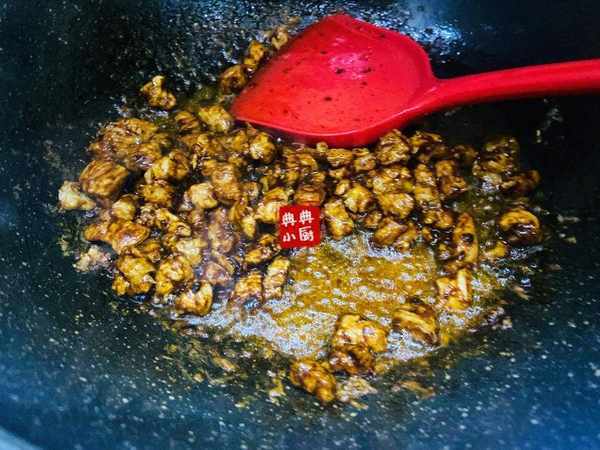 起油鍋,倒入瘦肉丁炒至變色,加入一勺蠶豆醬,翻炒至出香,炒至瘦肉丁包裹上醬色就可以瞭。