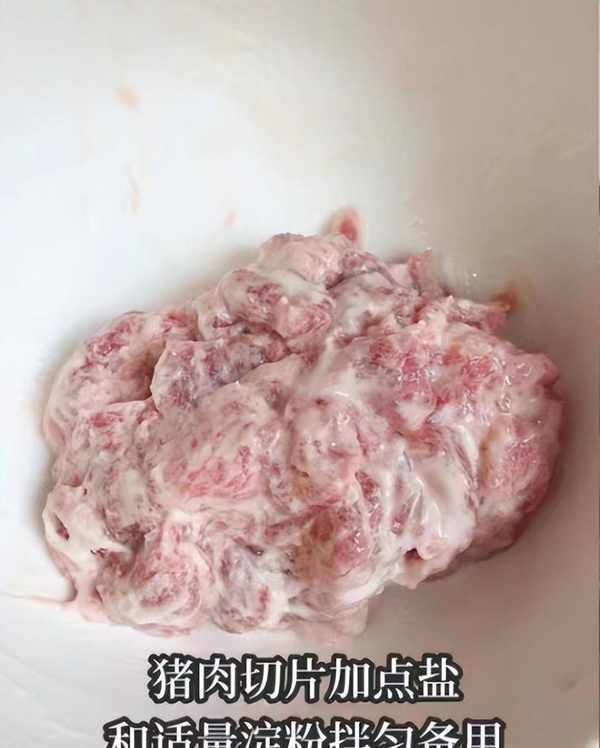 第二步:瘦肉用料酒去腥,加上一丟丟食鹽,加上生抽半勺,加上適量淀粉,加上少許清水,迅速抓一抓,將瘦肉片醃制入味。