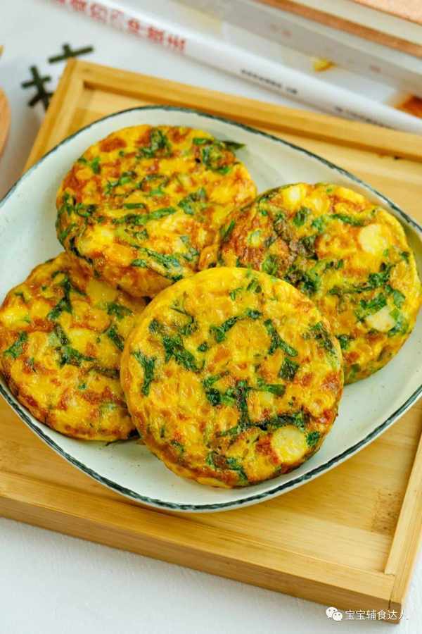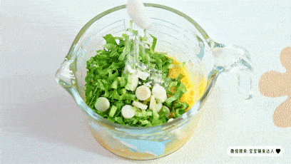 新鮮的油麥菜切碎,這個時間,小菠菜、生菜、韭菜也都很嫩,常見的綠葉菜你們都可以試試,孩子愛吃的就行。